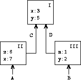 This shows a simple environment structure consisting of three frames, labeled I, II and III. In the diagram, A, B, C and D are pointers to the environments. C and D point to the same environment. The variables z and x are bound in frame II, while y and x are bound in frame I. The value of x in environment D is 3. The value of x in with respect to environment B is also 3. This is determined as follows: We examine the first frame in the sequence (frame III) and do not find a binding for x, so we proceed to the enclosing environment D and find the binding in frame I. On the other hand, the value of x in environment A is 7, because the first frame in the sequence (frame II) contains a binding of x to 7. With respect to environment A, the binding of x to 7 in frame II is said to shadow the binding of x to 3 in frame I.