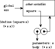 This figure shows the result of evaluating the define expression. The procedure object is a pair whose code specifies that the procedure has one formal parameter, namely x, and a procedure body (* x x). The environment part of the procedure is a pointer to the global environment, since that is the environment in which the lambda expression was evaluated to produce the procedure. A new binding, wihch associates the procedure object with symbol square, has been added to the global frame. In general, define creates definitions by adding bindings to frames.