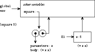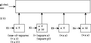 We see the environment structure created by evaluating the expression (f 5). The call to f creates a new environment E1 beginning with a frame in which a, the formal parameter of f, is bound to the argument 5. In E1, we evaluate the body f: