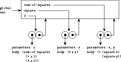 This show the three procedure objects created by evaluatin the definition of f, square, and sum-of-square in the global environment. Each procedure object consists of some code, together with a pointer to global environment.