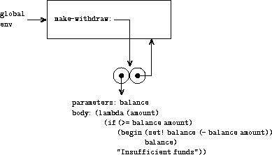 This figure shows the result of defining the make-withdraw procedure in the global environment. This produces a procedure object that contains a pointer to the global environment. So far, this is no different from the example we have already seen, except that the body of the procedure itslef a lambda expression.