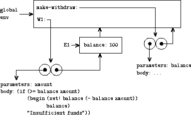 We begin, as usual, by setting up an environment E1 in which the formal parameter balance is bound to argument 100. Within this environment, we evaluate the body of make-withdraw, namely the lambda expression. This constucts a new procedure object, whose code is as specified by the lambda and whose environment is E1, the environment in the lambda was evaluated to produce the procedure. The resultin procedure object is the value returned by the call to make-withdraw. This is bound to W1 in the global environment, since the define itself is being evaluated in the global environment.